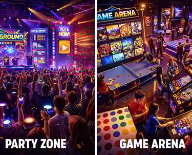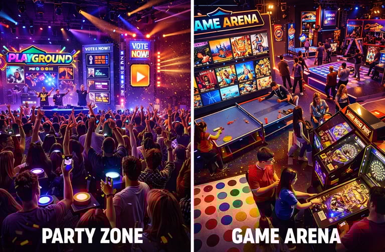Het event bestaat uit 2 werelden: Een Partyzone en een Game Arena.